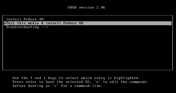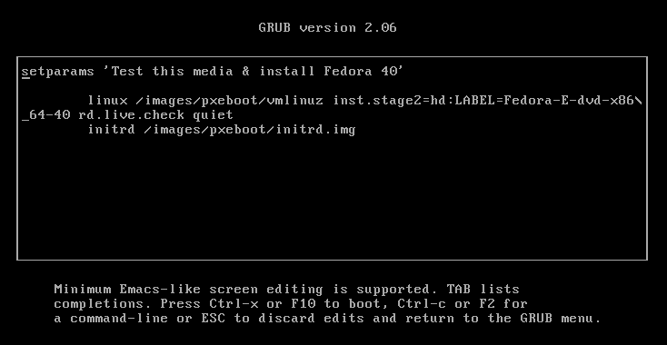 剛啟動Fedora時應看到這畫面。選擇有Test this media的一項並按E,然後進入這畫面