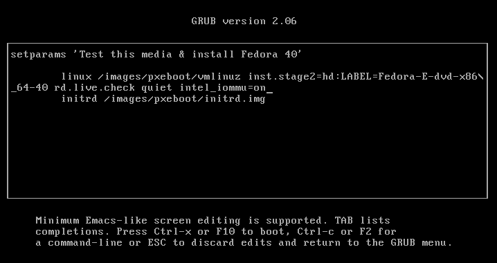 請在linux開頭的那一行的最後加上intel_iommu=on如圖),然後按F10啟動Fedora。